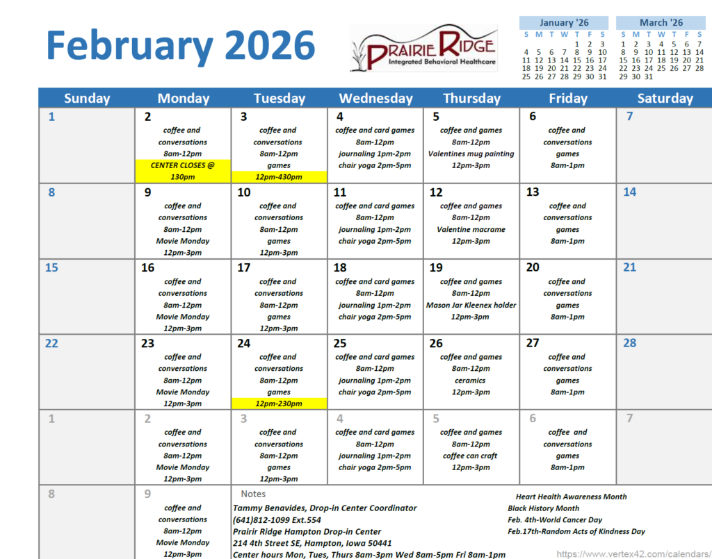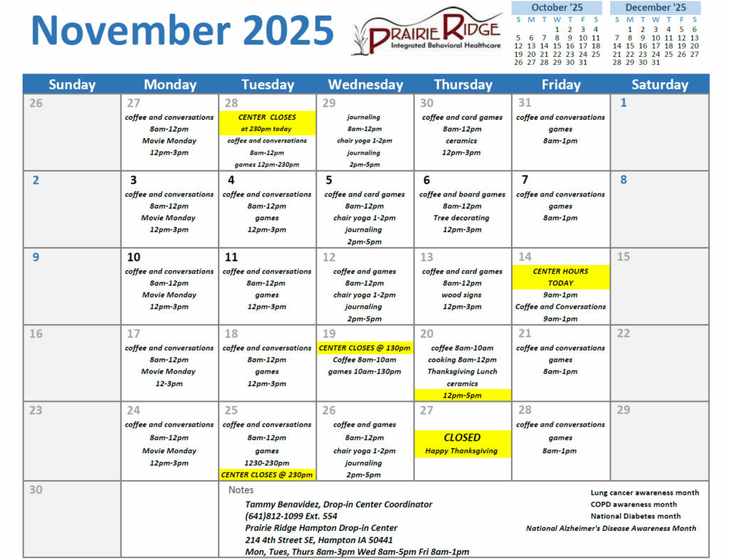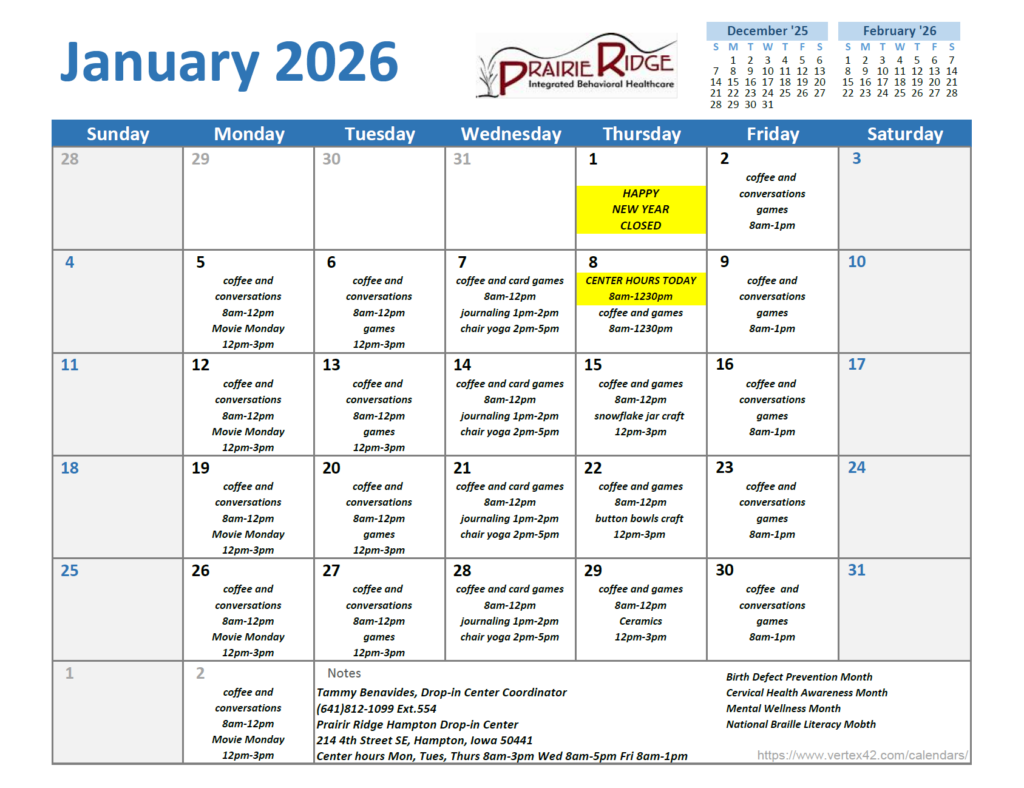 Our Franklin county drop-in center is conveniently located near the center of Hampton, IA. Our team of mental health professionals and consultants is ready to help our community members.